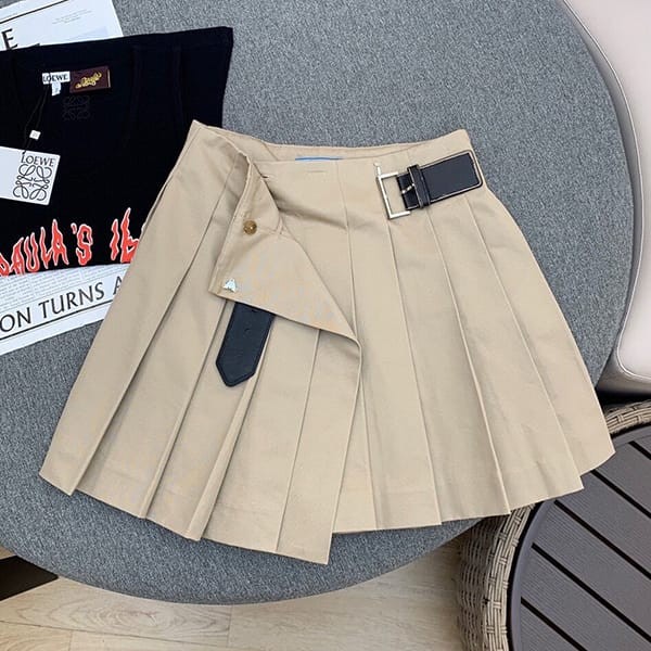 ライトブラウン、コットン、トライアングルロゴプレート、プリーツ、サイドにバックル、ひざ上丈。